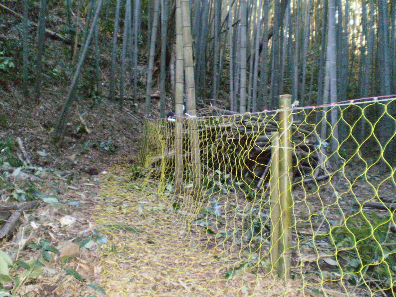 2日目は入口の更なる整備並びに奥の中段平面部に、伊豆の国市役所の指導のもと、共にイノシシ除けネットを115m張り、前日から整備に着手した西側のハチク部にも試行で30mにわたって張りました。