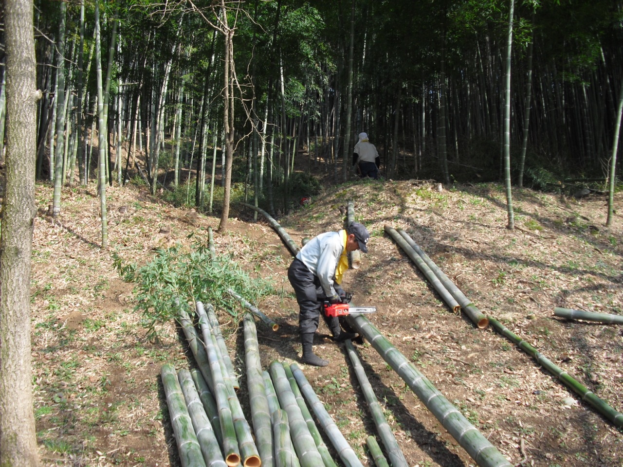 大型丸ノコ2台連結を2パーティで竹灯籠は3,200本強製作、一方不足分の竹の間伐は少数精鋭隊が、チェンソー2台をうならせて灯籠1,100本分を伐り出しました。
