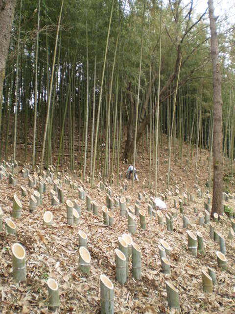開花から3週間と長く桜が咲いています。花吹雪のなか小机城址市民の森では120名のお客さんを迎えて、日本の竹ファンクラブが「たけのこ祭り」を開催。各エリアに分かれて、たけのこ掘り隊はクラブの各リーダー指導のもと悪戦苦闘を開始! モウソウチクのたけのこは20cmほど掘り下げるが、途中で地下茎が絡んでいてそれはそれは大変。