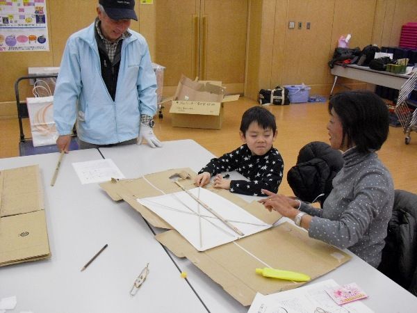 翌日は一転した寒さと風で気温7℃。親子凧作りと凧上げは暖房の効いたプール多目的ホールで竹ヒゴを組み、和紙を貼りつけて参加者が思い思いの字と絵を書いて仕上げました。作業工程が細かくて子供さんは見ていたり、下敷きの段ボールにいたずら書きをしたりで時間をもてあまし気味。字と絵を書く段になると、一転してはつらつさと元気が戻りました。
