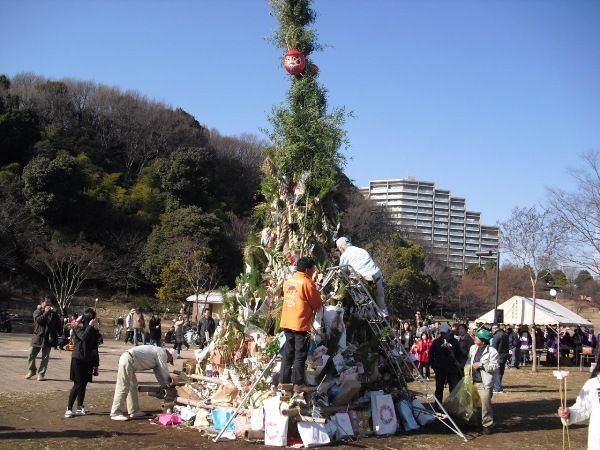 七草粥も終わり、都筑区北山田のどんど焼きは昨年不足した紅白の餅を刺す餅竹を5割増やして1,500本。公園化で皆伐した竹が最近復活してしまい、これを角柱用に伐採してユニック車のクレーンで立て、さらに横浜国際プール置場より枯竹を運搬して立てかけた。何と南風!ポカポカ陽気、やぐら組み、続々持ち込まれる正月のお飾り等の取付、餅竹の熱湯消毒と手伝い、火で暑くなり、これで今年一年福が来っぱなし!