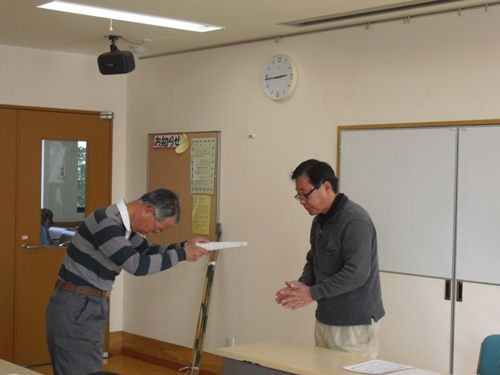 平成23年度も残すところわずかになりました。晴天の下 竹の学校「竹林管理コース」の最終実技と講義、終了式がありました。暖かくなったこの日午前中は、竹の間伐とタケノコ保護用の竹札を作りみんな大汗をかいたようです。午後は城郷小机地区センターに移動して平石講師の最終講義、修了証の授与となりました。修了証は履歴書の資格取得には書けないが! みなさん1年間学んだ学問・技術をもとに、これからも竹文化の発展に誇りと自信を持って寄与して行くことでしょう。