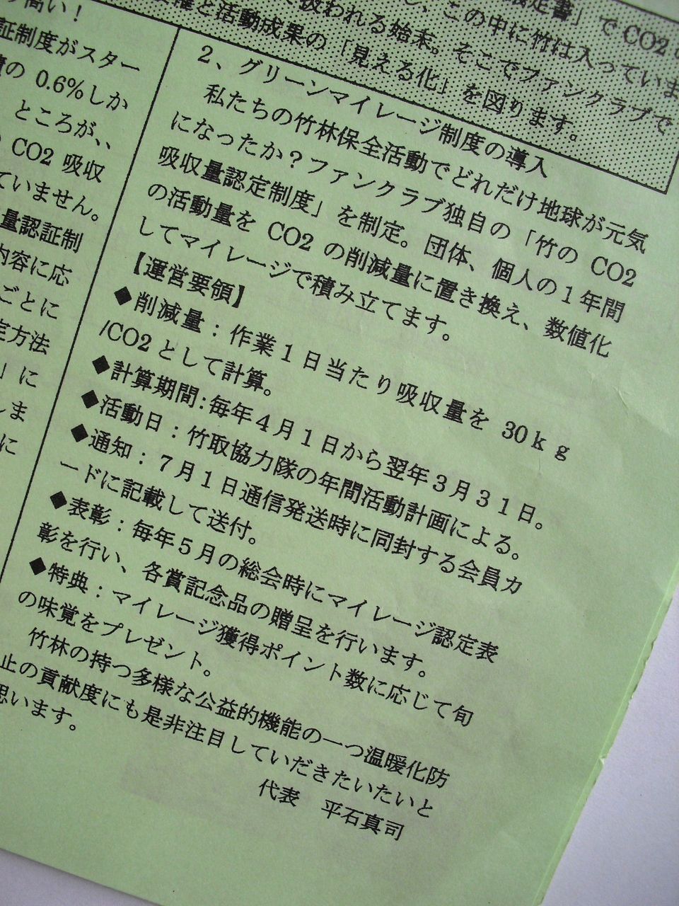 日本の竹ファンクラブの竹林整備作業に参加するとマイレージポイントがたまる。今年度も竹取協力隊の定例活動日は100日以上もあり、会員による竹林の保全活動をCO2削減量にしてマイレージで積立、毎年1回プレゼントが送られます。