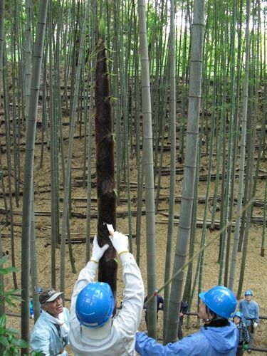 その後は親竹として育てる筍を残し、その他の中から3mほどに伸びたものを選んで竹水仕込み。先端80cm程の柔らかく美味なる穂先筍が約20本収穫できました。今年はたけのこ堀りが中止となったので久しぶりの定例活動、3週間後には残った筍の各節に竹水が溜まります。 (NGS)