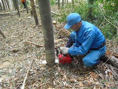 竹林の斜面上部で3台のチェンソーが快調にうなる