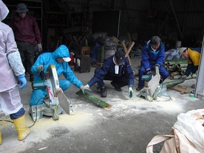 次回は園内最奥の作業場 大型丸ノコ4台で竹灯籠製作 雨天決行