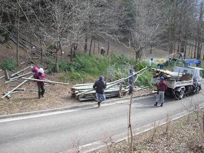 下の平場で定尺に切り 残材はこどもの国職員が所有の大型チッパー機で処理