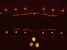 記念館正門から望む噴水周囲 ここに灯れば 素晴らしい、が・が・が!北風が建物裏から巻いて風速を増してビル風、おまけに噴水から出る風圧もある!