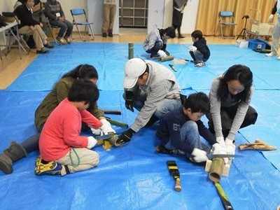 ふたりの共同作業で太い竹を切る ドリルで浮力安定用の削孔