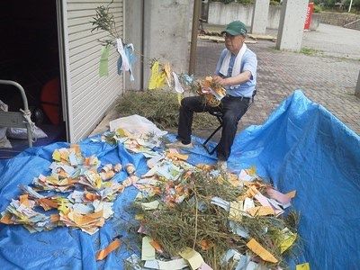 今年も女性社員が、竹ファンさ〜〜ん6月25日にお願いしま〜す。は〜いと3人組。広いロビーは少々暗くて飾りは目立たない。でもお客の数は半端ではない。毎日テーブルに短冊が追加で置かれる。あっという間に竹笹葉は隠れてしまう。かくしてロビーを支える丸柱2本にくくった竹6本、下部は枝葉をたくさん挿しておく。あっという間に短冊は束になってしまう。タコ糸から離されたのは2,950枚をカウント。そのほか期間中に床に落ちたもの数知れず。