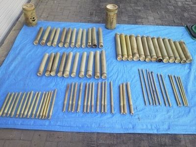 8月2日から始まるワークショップ竹の声音楽祭用の材料の準備です。 竹取協力隊員が心こめて集積した材料。 油抜き後に何回か天日干しと陰干しをして、日増しにアメ色となった物を短尺切断。 楽器つくり1週間前に加工しない部分のバリ取りを終えました。写真は4種類の竹材とバチ棒の一部