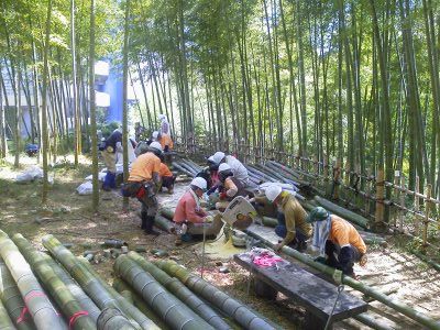 竹灯籠用の竹材間伐が150本、稈の下部は直角切りで上部は45度の斜め切です。3,000本の製作も順調、設置初日は竹林急斜面と平坦地を含めて1,800本が済み、27日にはUPSジャパン株式会社さん強力7名の参加協力もあって、まつり当日に設置の部分100本を残して終わった。