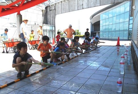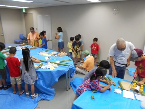 横浜国際プール会議室3、夏休みカルチャー教室に出前。 小学生が水鉄砲をつくり、外のボルダリング壁の下で、びしょびしょになりながら標的めがけて水を飛ばしました。一輪車3台たっぷりの水を使用、ついには我々も標的になりました。参加募集はアッという間に埋まったそうで、気前良い竹ファンの面々が事前に数日をかけてスイセンと花瓶セットをつくり、全員にお土産で持ち帰ってもらいました。