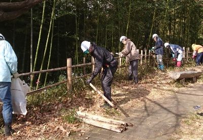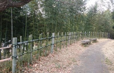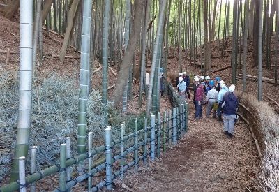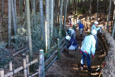 10月に開催した竹灯籠まつりのメイン会場から離れた散策路港北IC寄りの北側10スパン18ⅿを改修。年明け最初の活動には多くの竹取協力隊員が集まった。古くなり枯れてしまった柵は前回解体済みで、一挙に材料つくり、組立と進んだ。胴縁も立子もダイナミックに太さを強調、でも細い立子も利用して2本使いで負けずに太さを表現するに徹した。やがて間伐竹の利活用で太く、みどりきれいに輝く竹で四ツ目垣が完成した。次回は竹穂垣を改修します。ここは京都か修善寺か・・・にします、みなさ〜ン、大集合ですヨ〜。