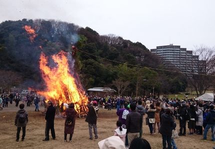 地域最大のどんど焼き 山田富士公園の竹4本を心柱に 枯竹で骨組み