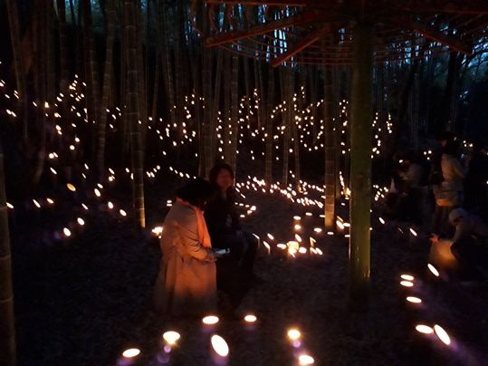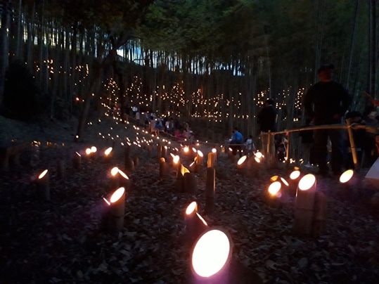 オレンジ色に染まる竹灯籠と竹林が醸し出す幽玄の静寂