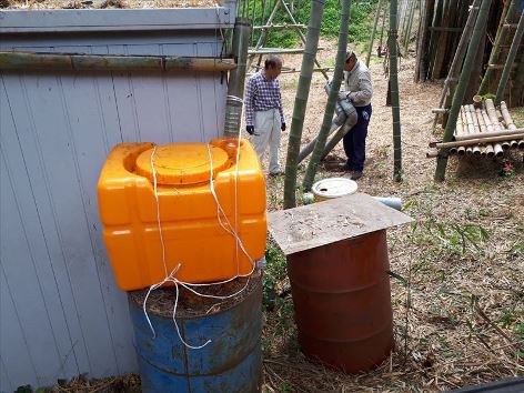 倉庫屋根の雨水 竹樋を伝い貯水 エコな食器洗い