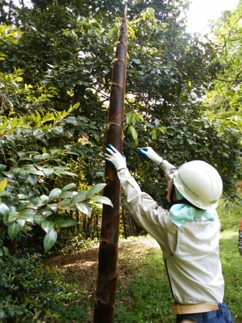 枯れた杉の木を伐採した切り株 細いマダケも切り口が見える
