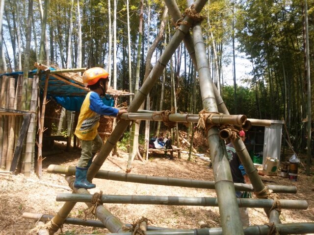 単管を打込む 竹の大筒で親柱・間柱をかぶせる