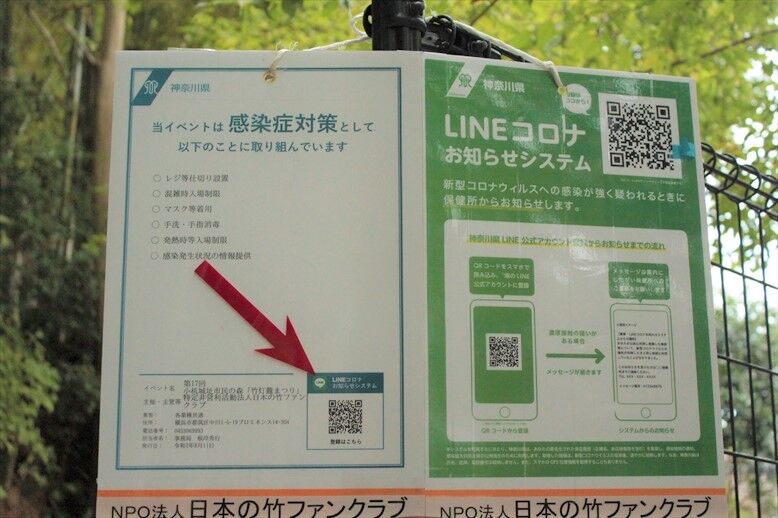 厚生労働省新型コロナウイルス接触確認アプリ(COCOA)の使用推奨と5か所の竹林フィールドで、神奈川県LINEコロナお知らせシステムの活用をしています。