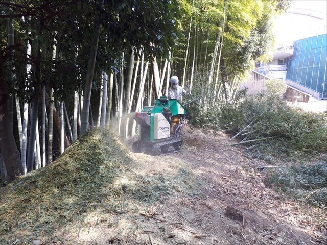 最初は竹を間伐 使わない上半分は林床へチップとなって戻る