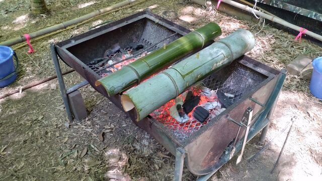 ドラム缶の半割で モウソウチクの竹筒ご飯