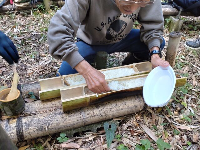 ワイルドに 竹筒ご飯だ! ウマ〜ィ!
