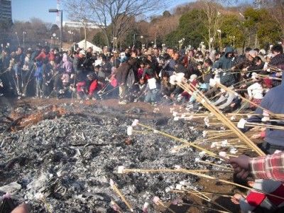 大きく広げられたアツーイ残り火で紅白の餅をあぶって無病息災を祈願